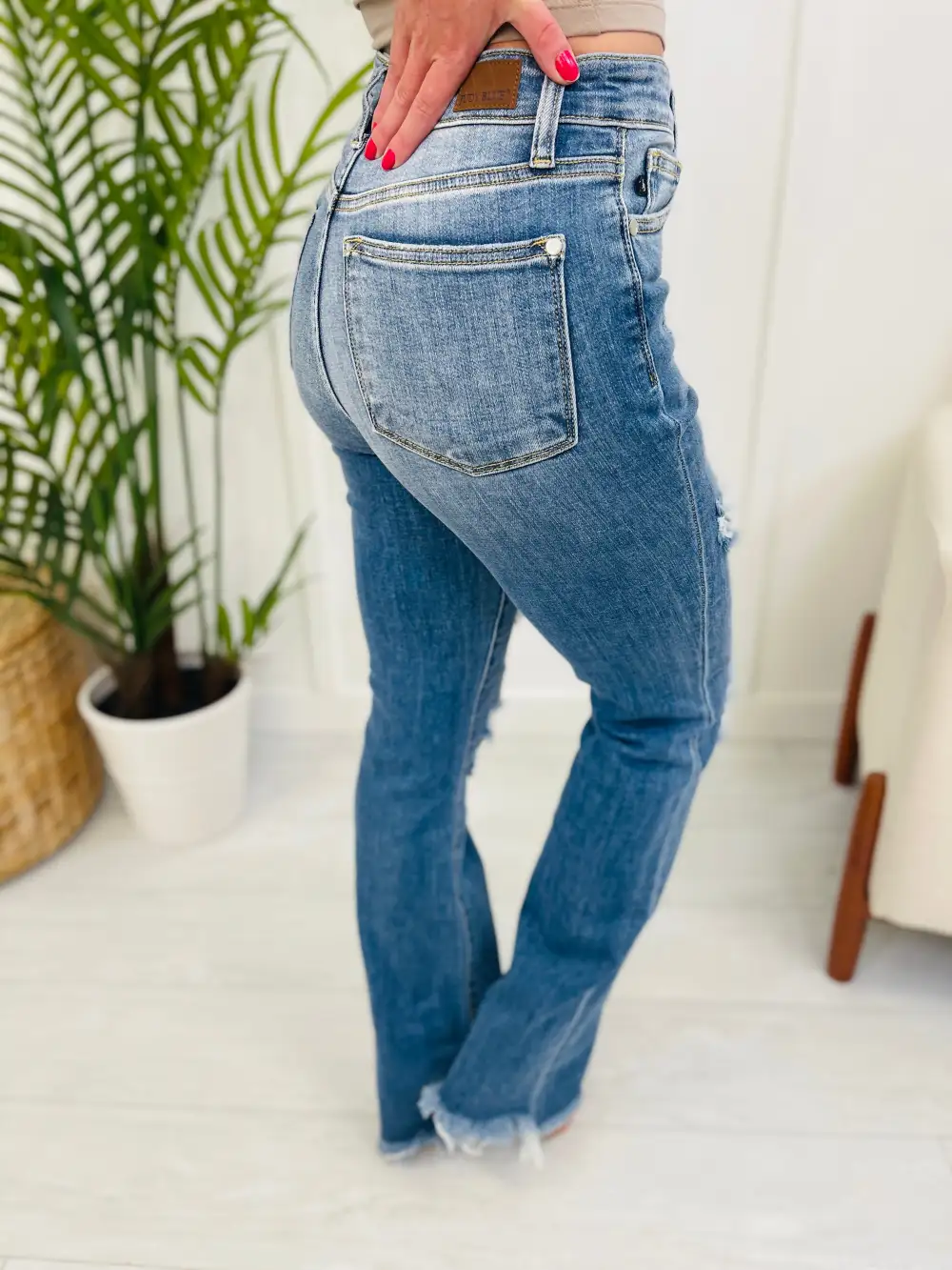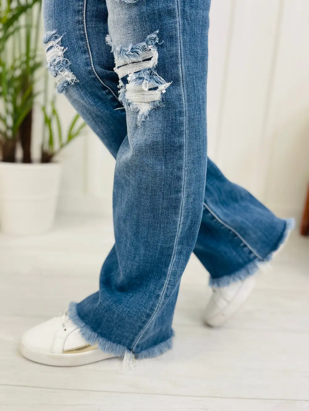 Mid Rise Button Fly Distressed Eliza Flare Jeans