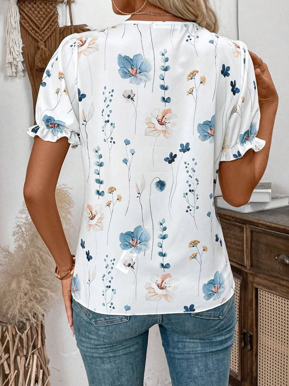 V-Neck Lace Splicing Printed Puff Sleeve Blouse