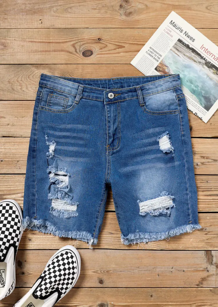 Ripped Hole Frayed Denim Shorts - Deep Blue