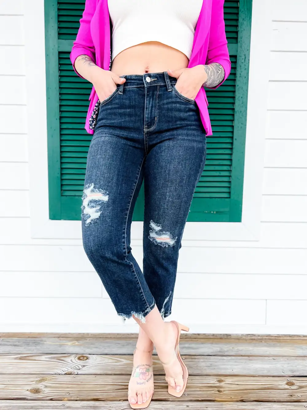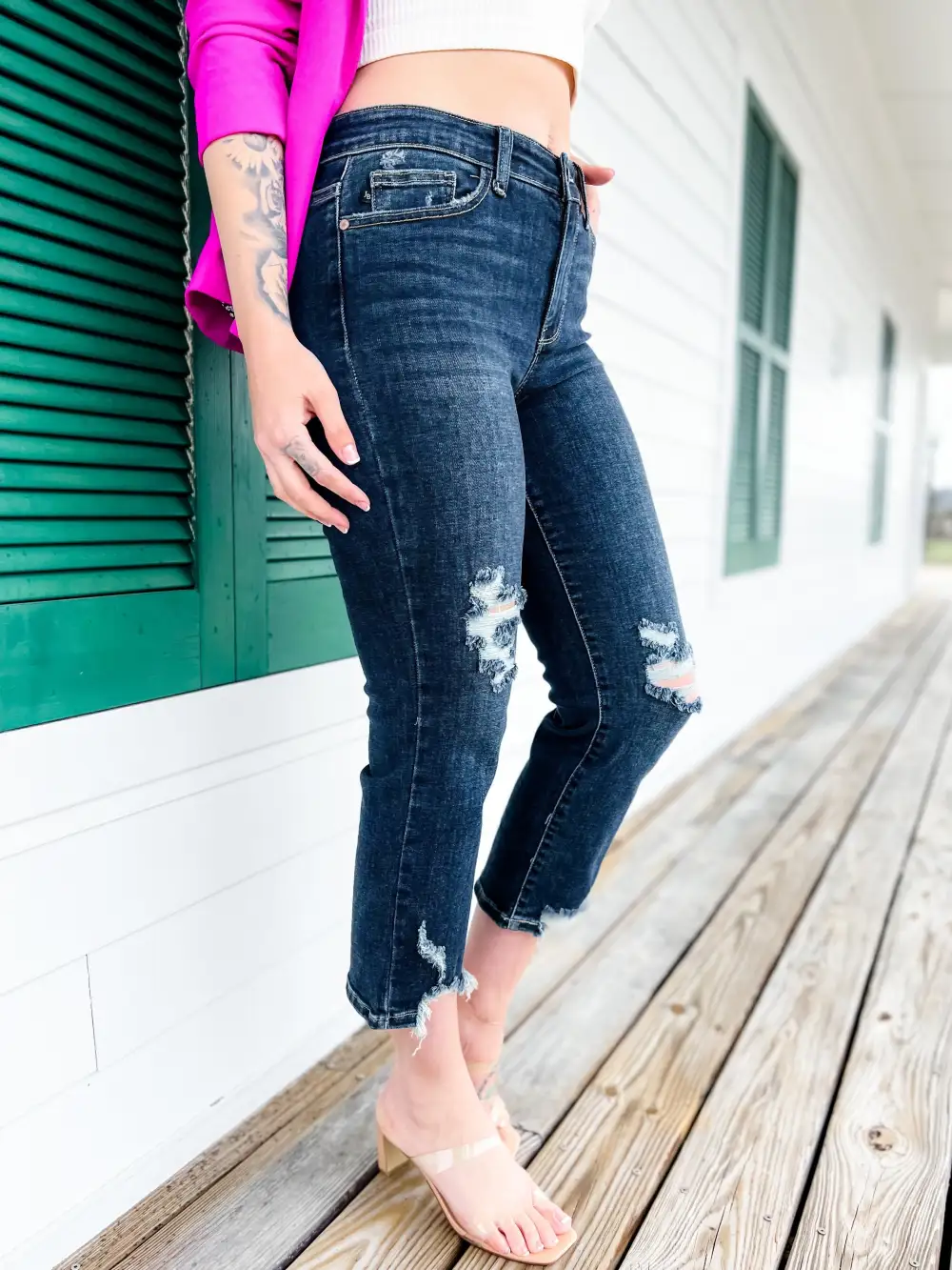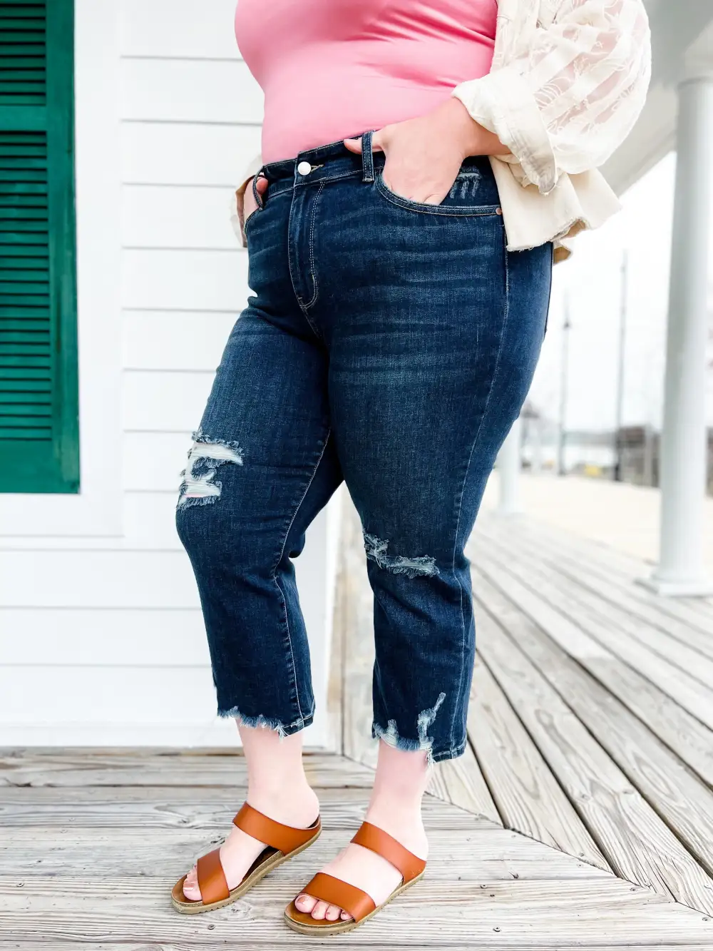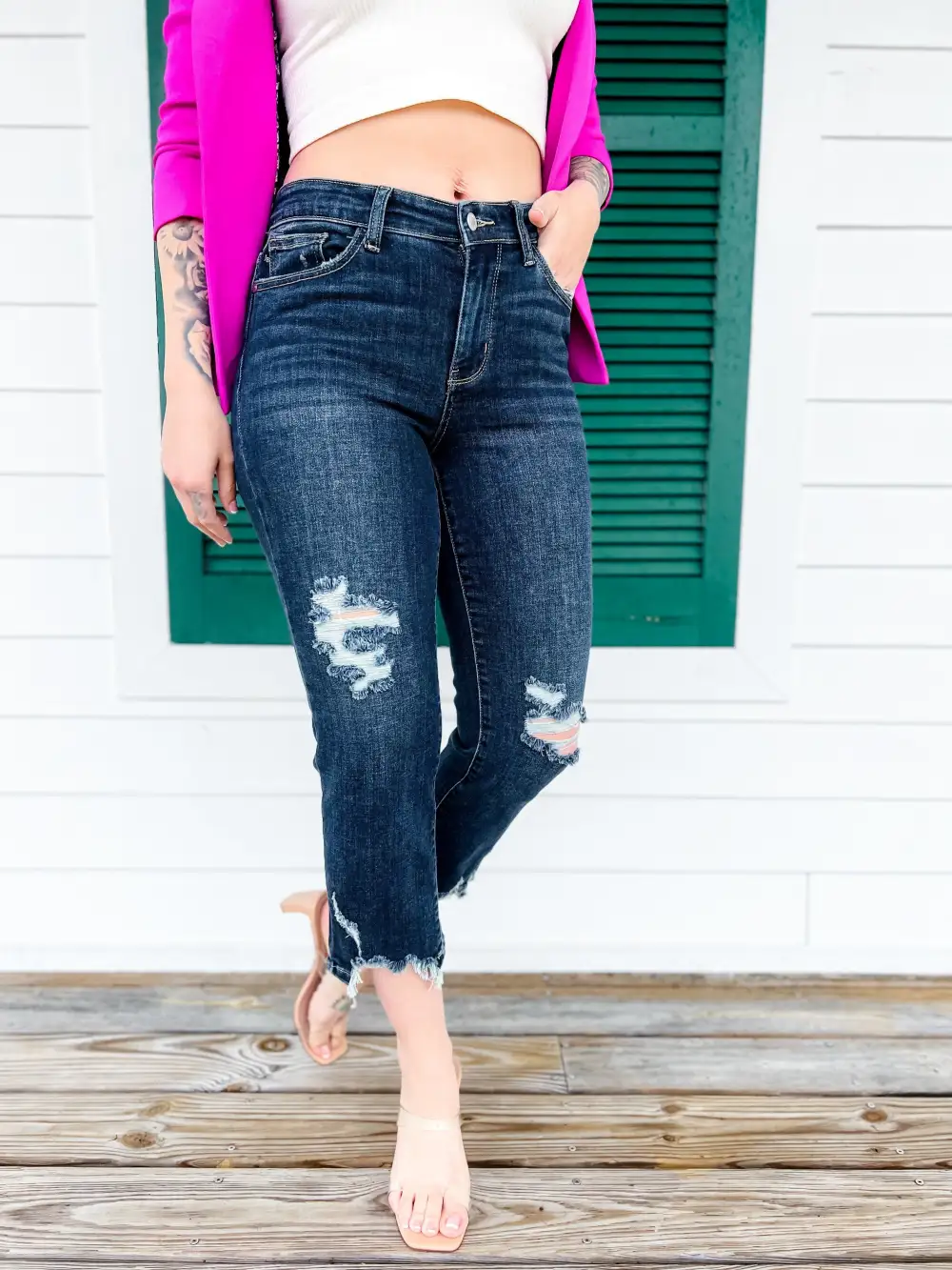 🔥Hot Sales🔥 After Hours Dark Wash Destroyed Hem Cropped Straight Leg Jeans