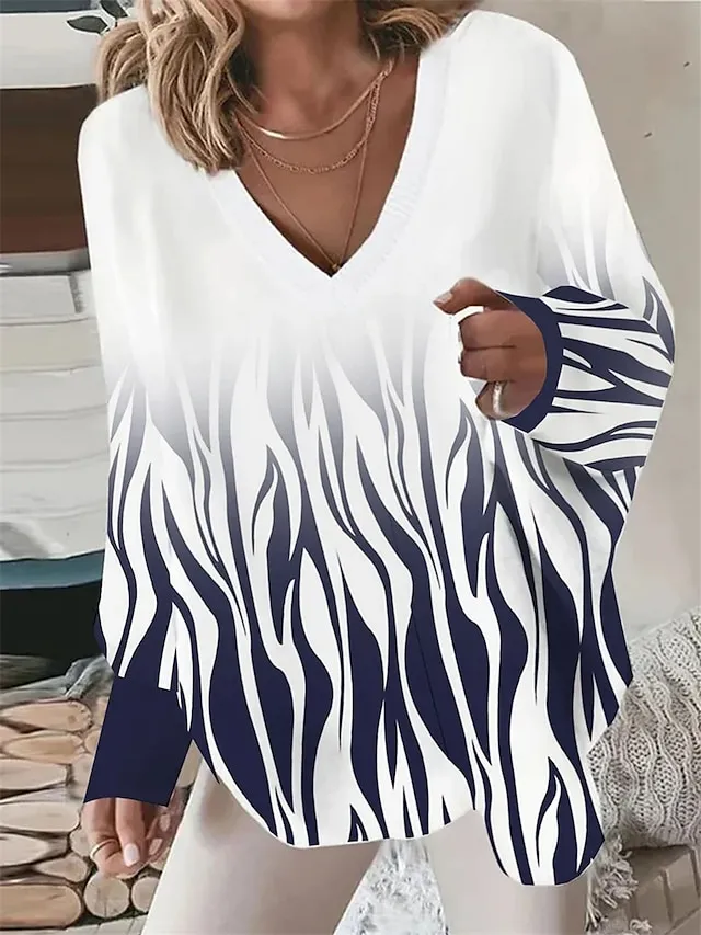 Women Long Sleeve V-neck Geometric Colorblock Top