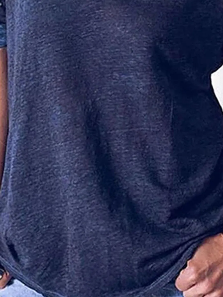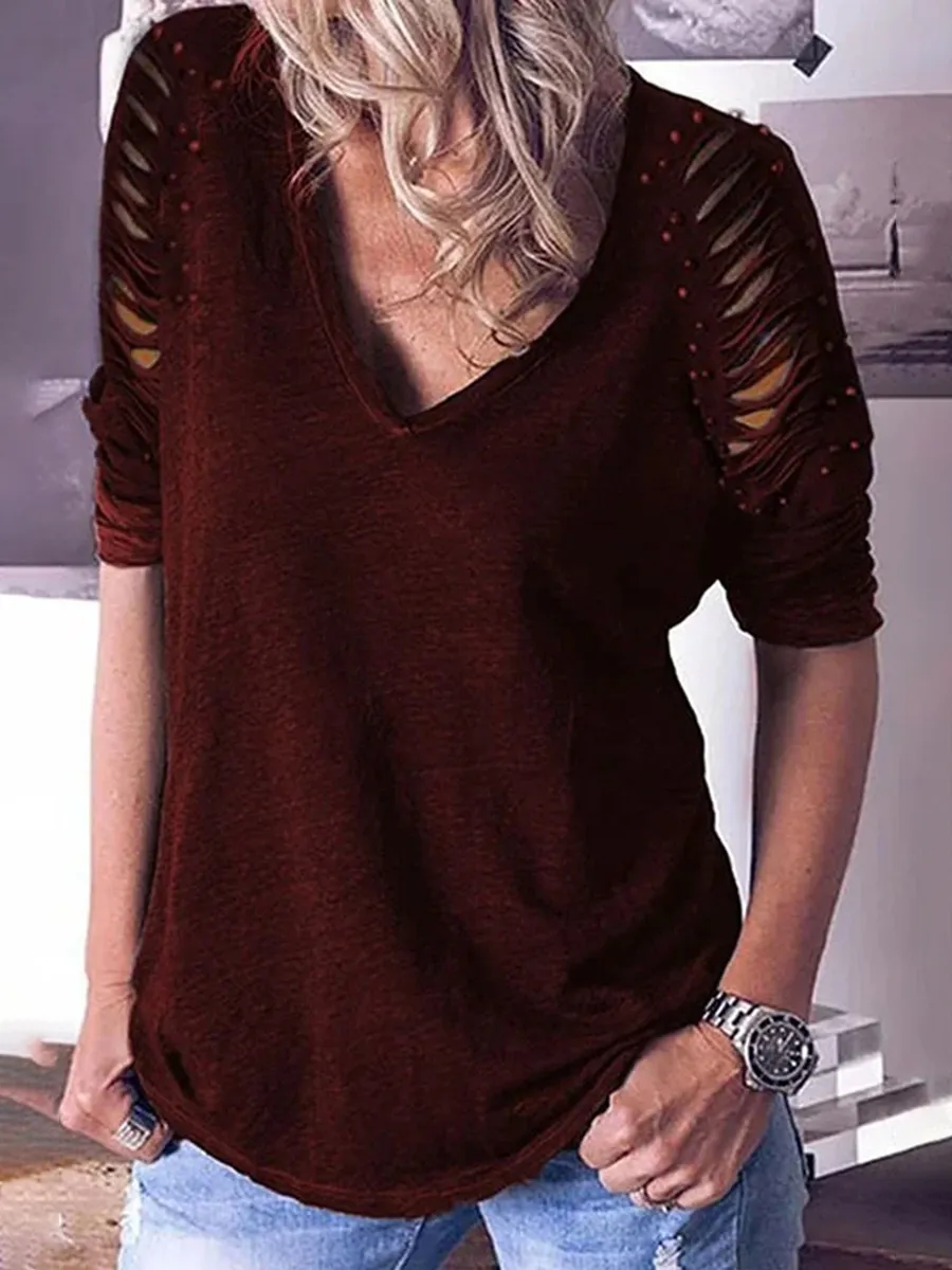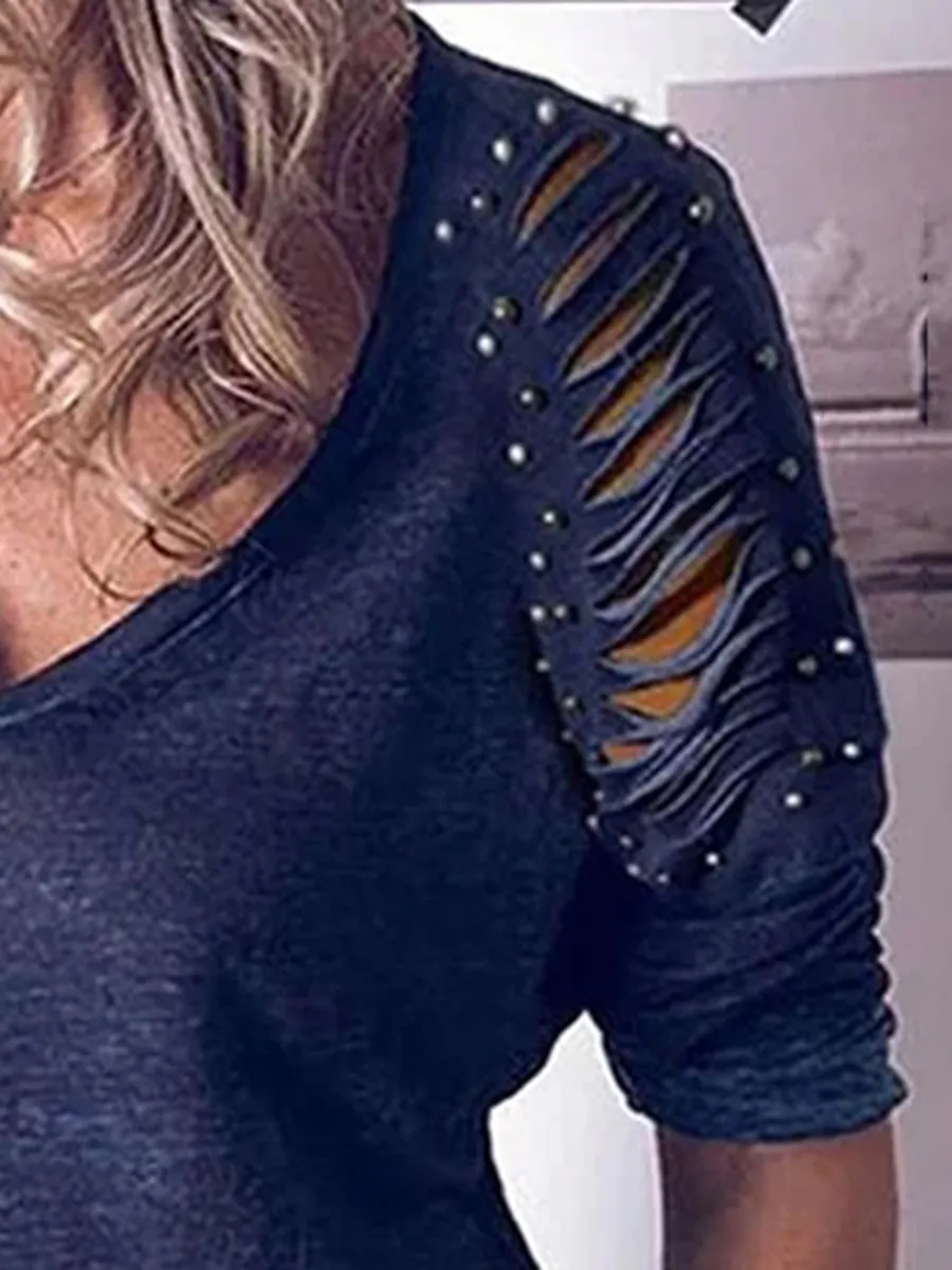 Women's Casual Patchwork Hollowed Out Beaded V-neck T-shirt