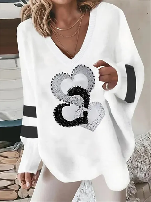 Women's Pullover Sweater Jumper Jumper Ribbed Knit Print Animal V Neck Stylish Casual Outdoor Daily Summer Fall White / Black Black S M L