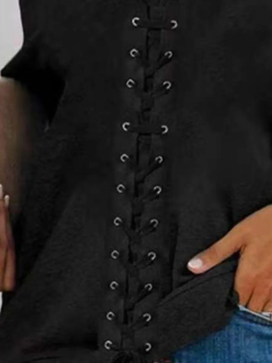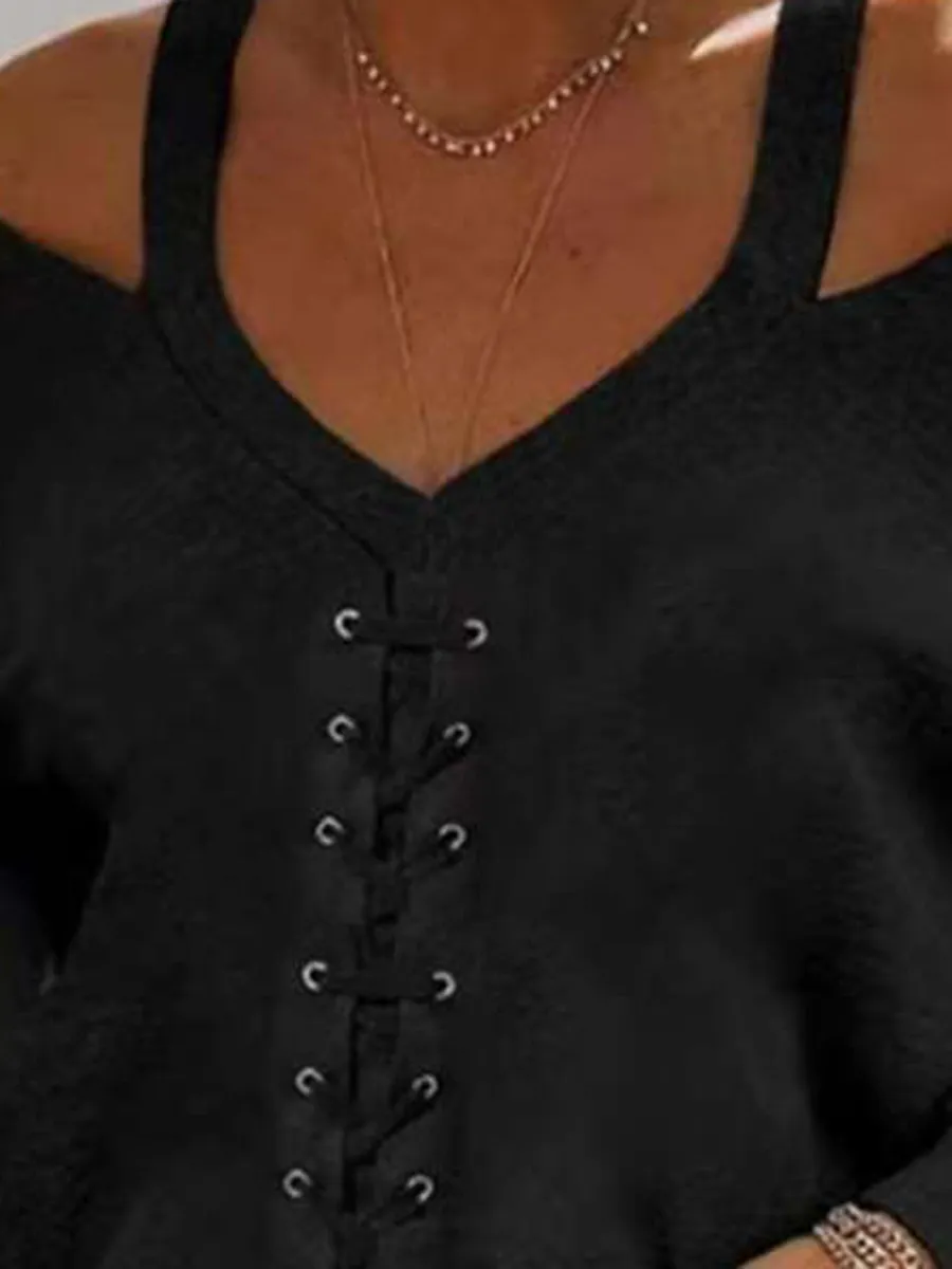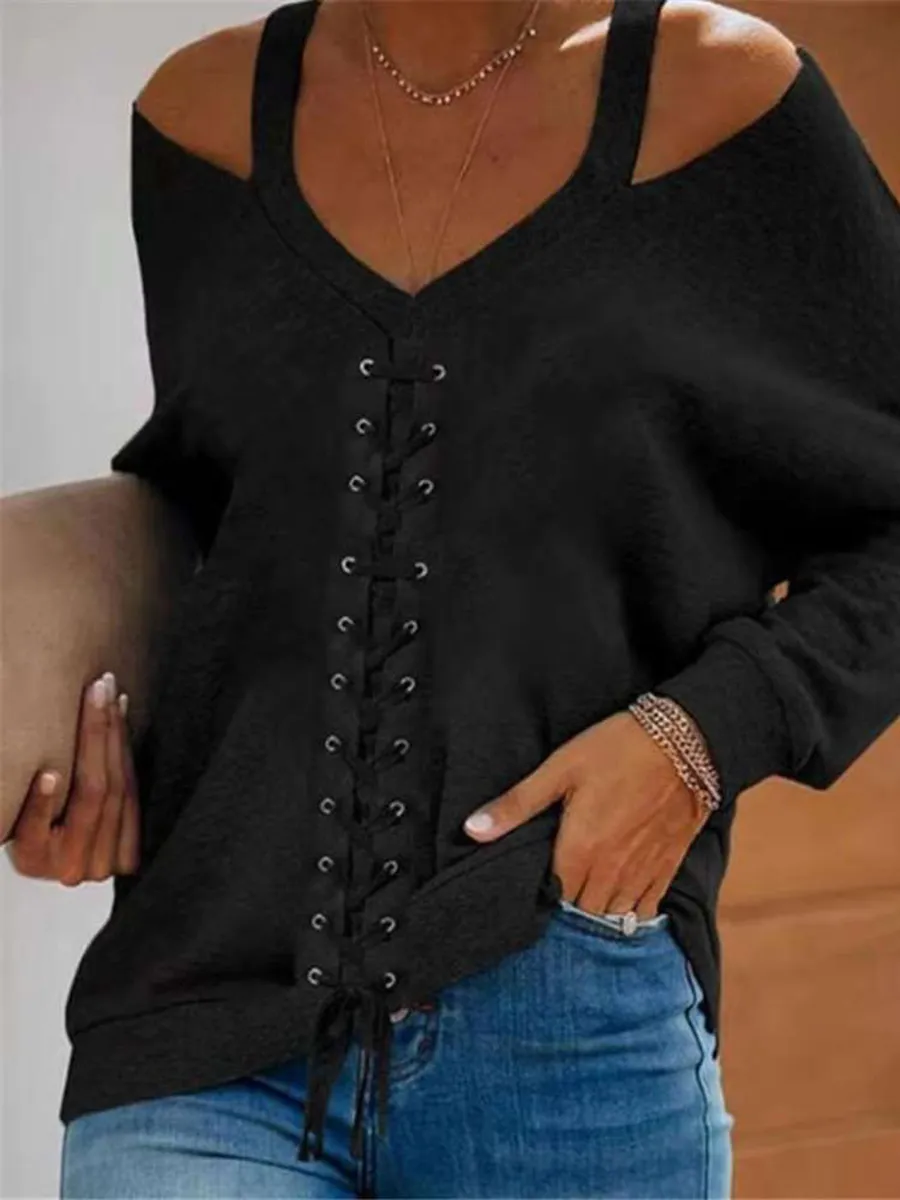 Women's Fashion Casual Pure Off Shoulder Long Sleeve Lace Up Top