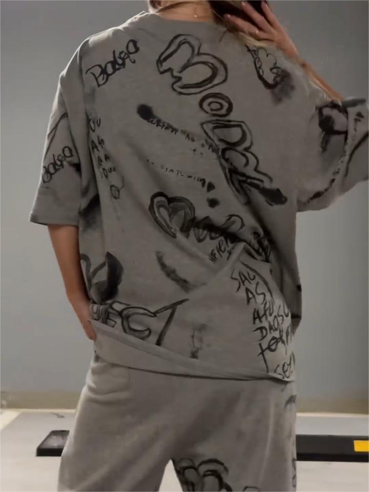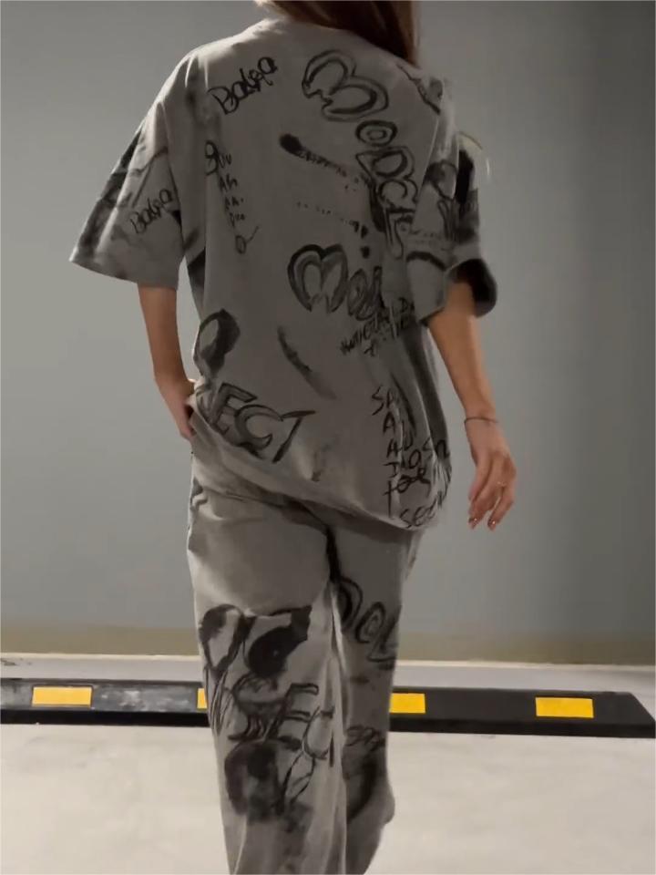 Fashion Loose Graffiti Round Neck T-shirt Two-piece Set