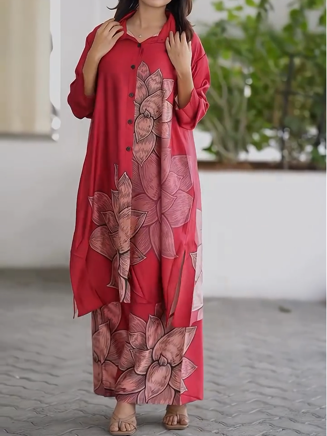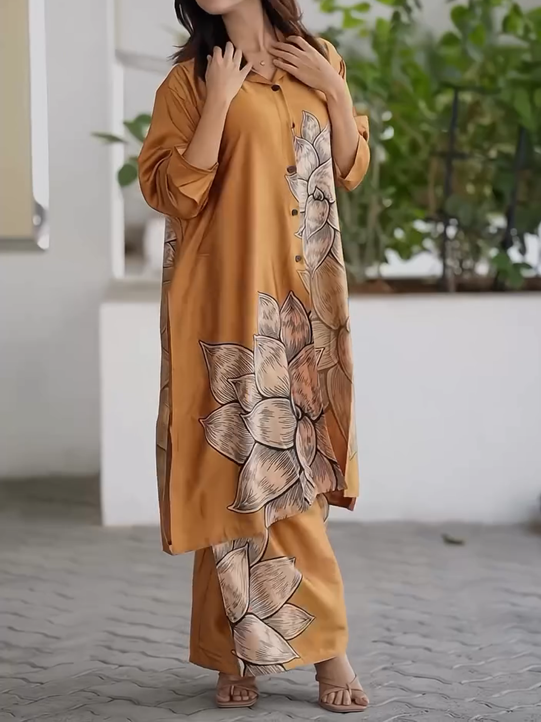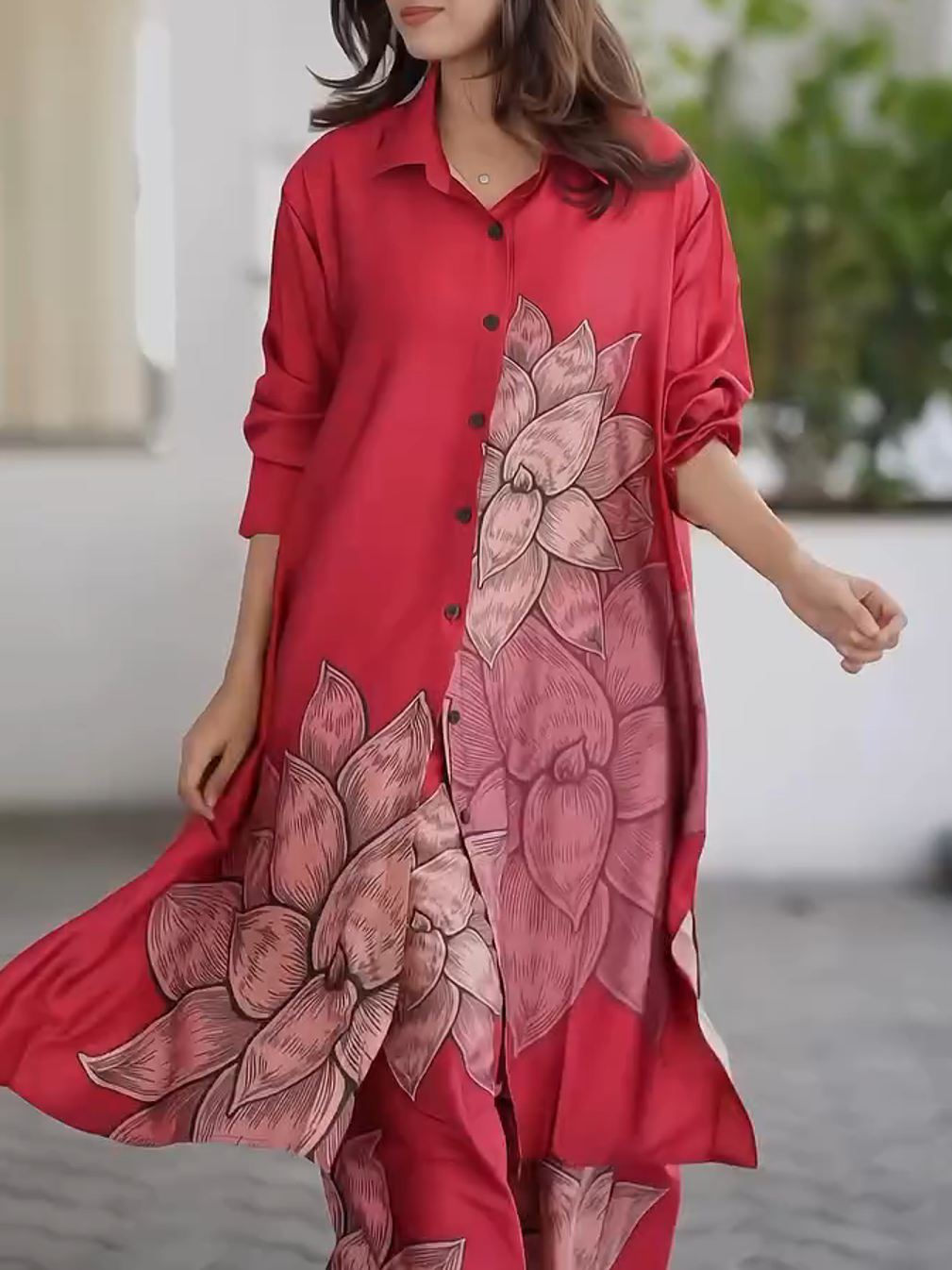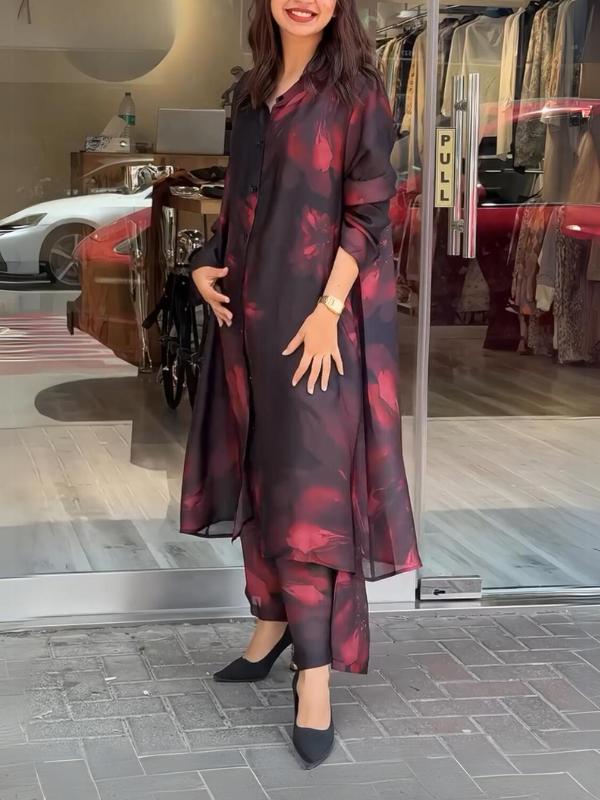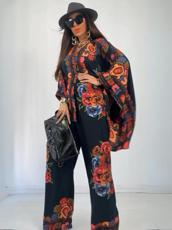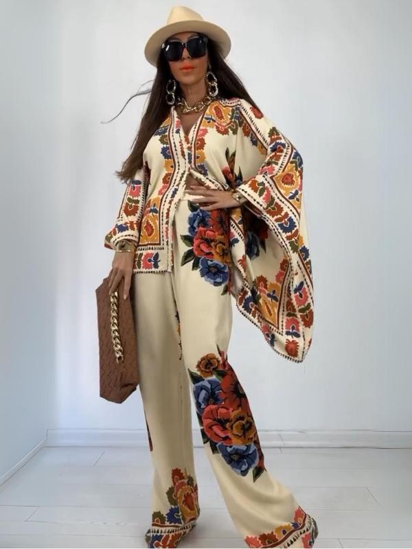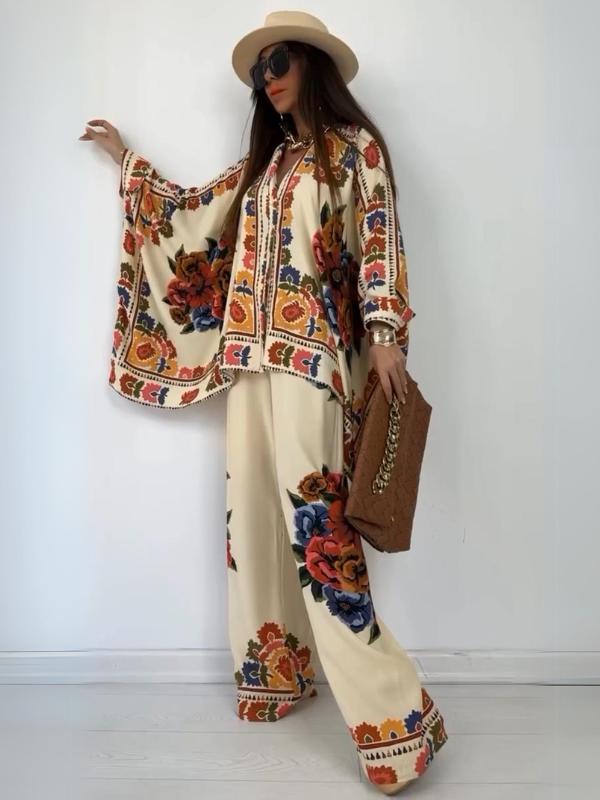 Women's Fashion Loose Casual Printed Long Top and Wide Leg Pants Set