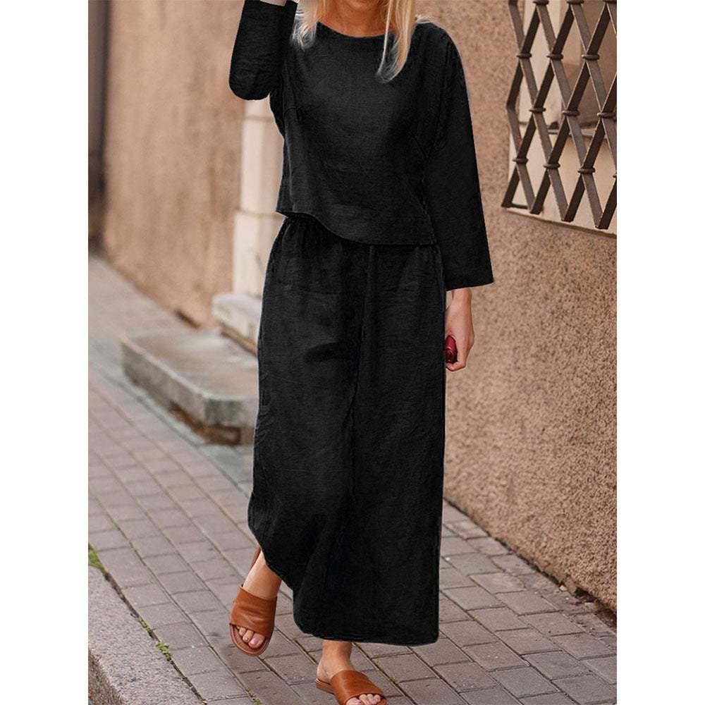 Plus-size Women's Solid Color Cotton Hemp Casual Long-sleeved Loose Suit