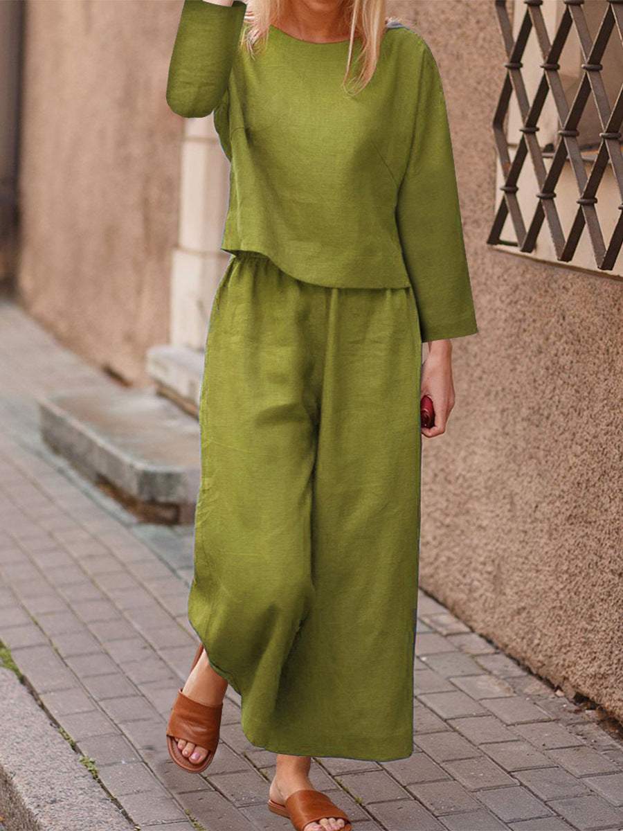 Casual solid color cotton and linen pants two-piece set