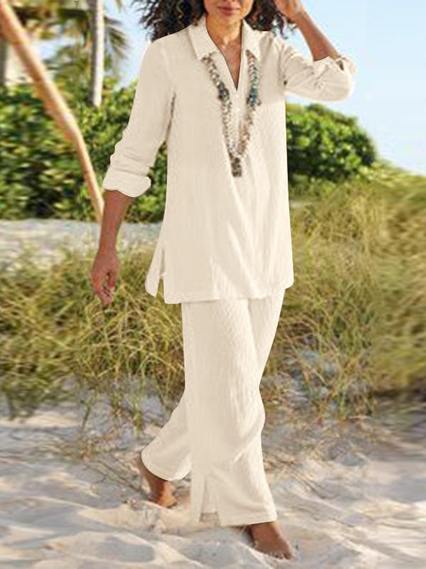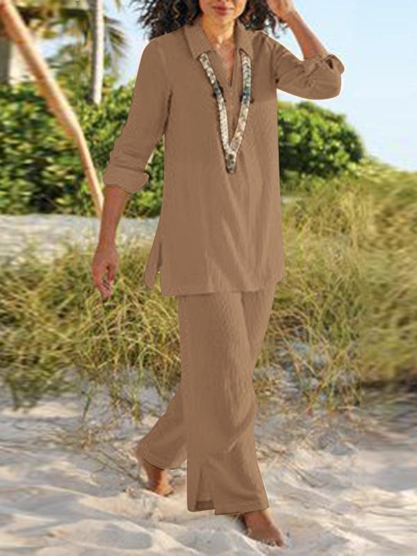 Women's Fashion Casual Lapel Button Shirt And Pants Two-Piece Set