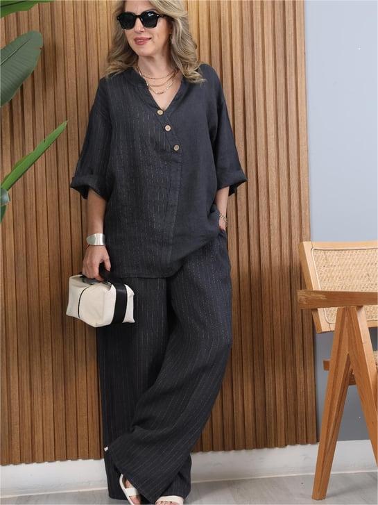 Women's Casual Striped Cotton Linen Set