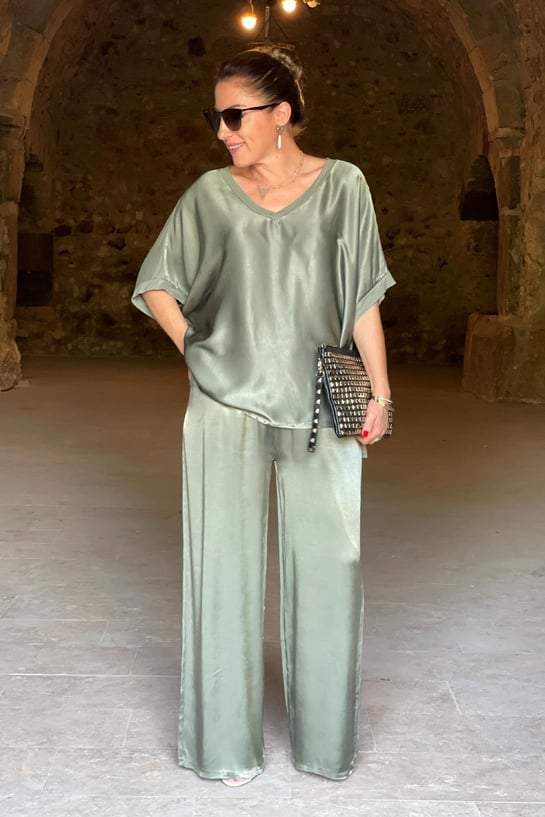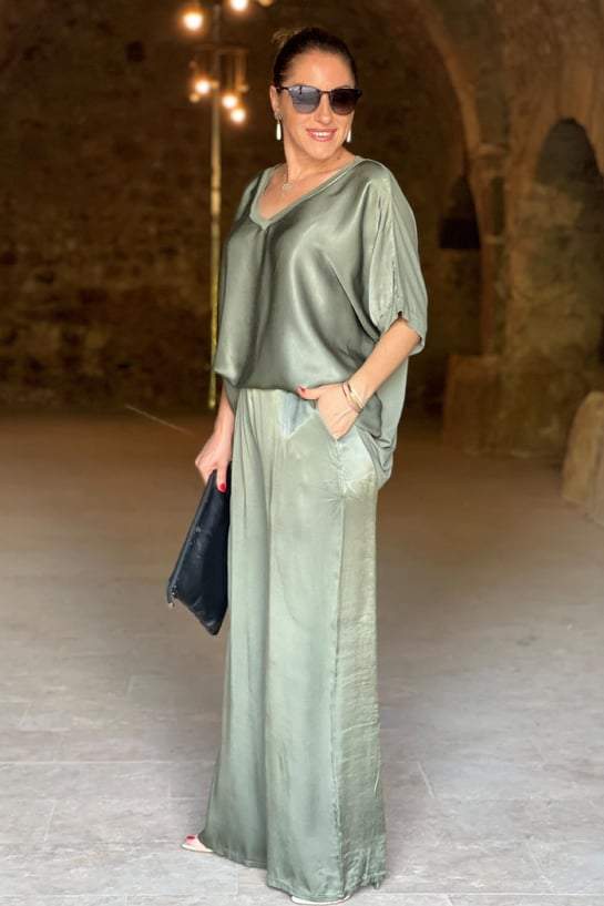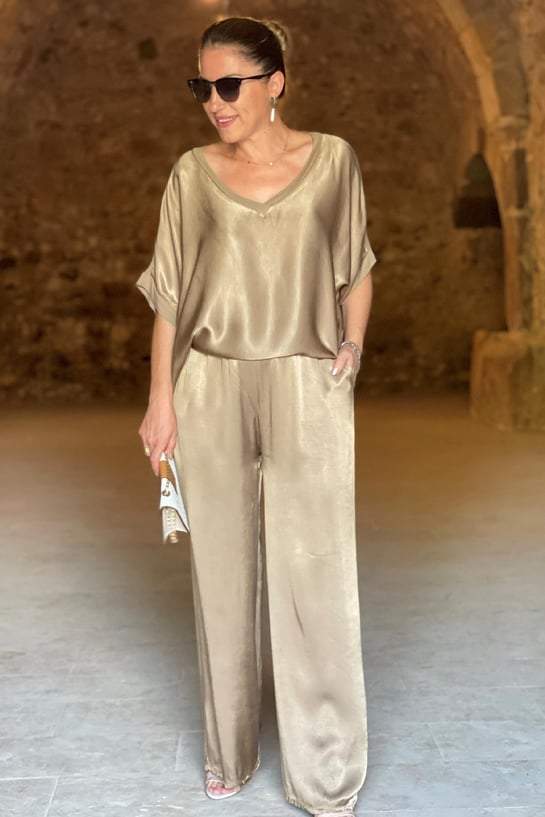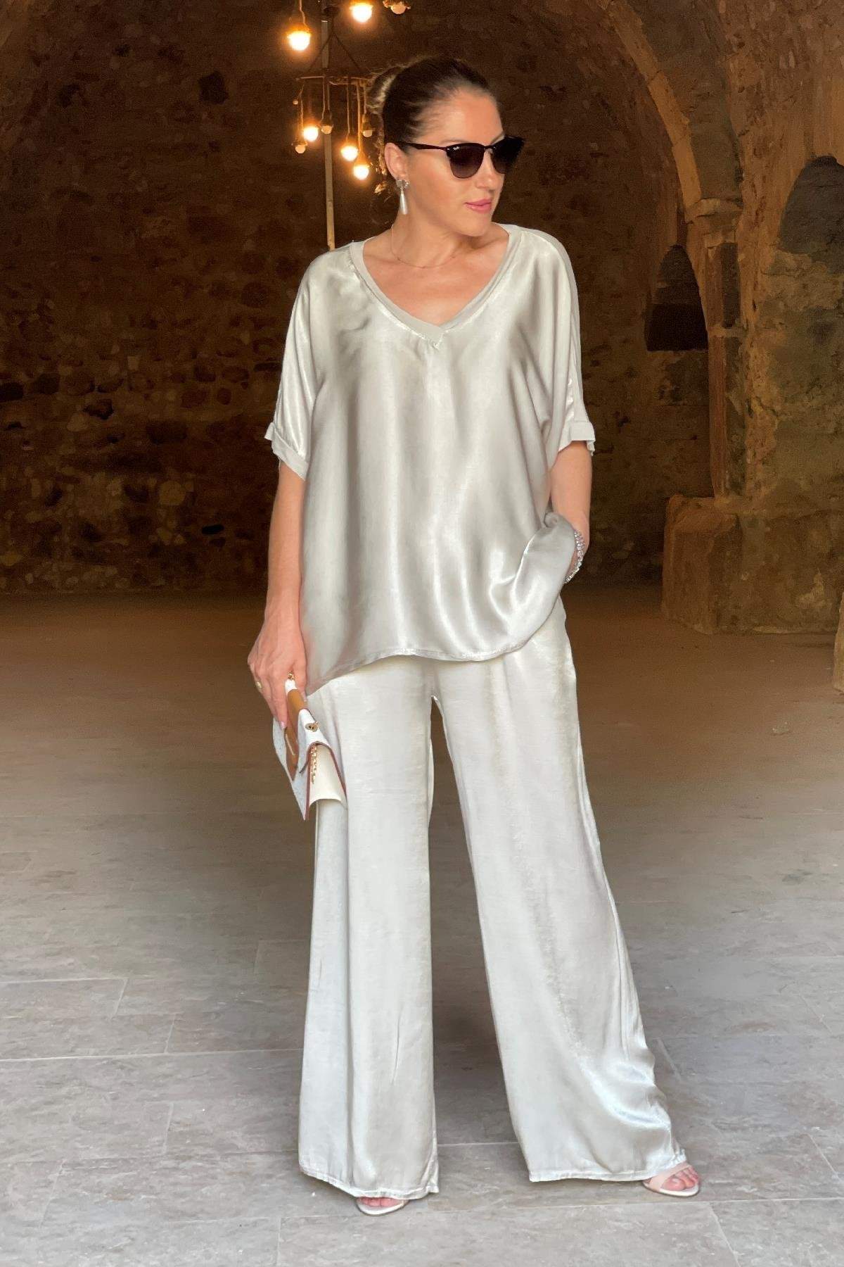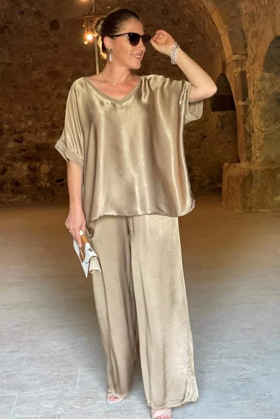 Casual women's cotton and linen V-neck bat sleeve top + slit pants two-piece set
