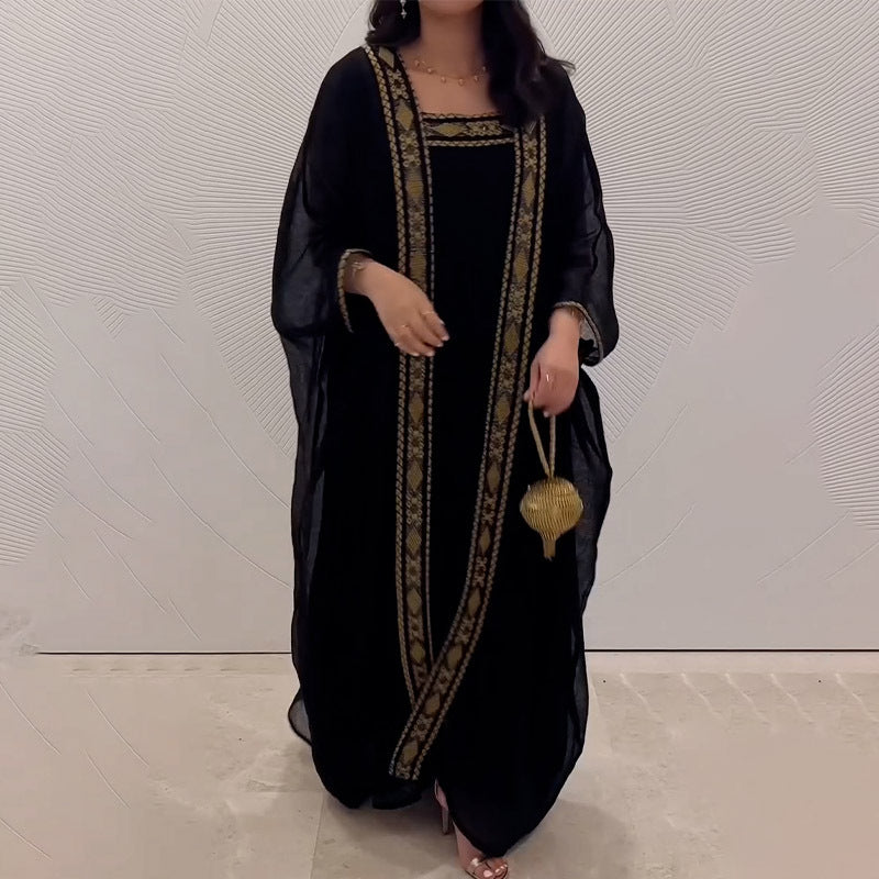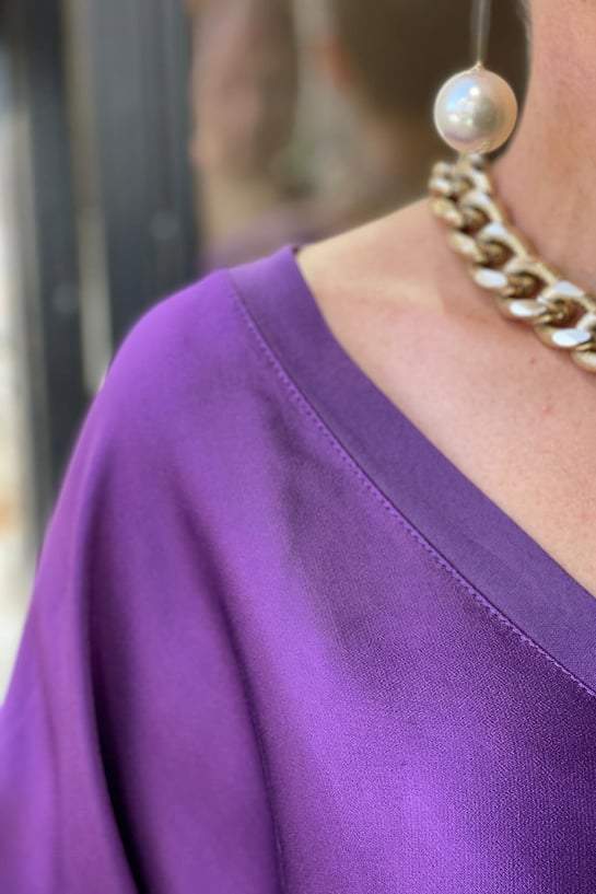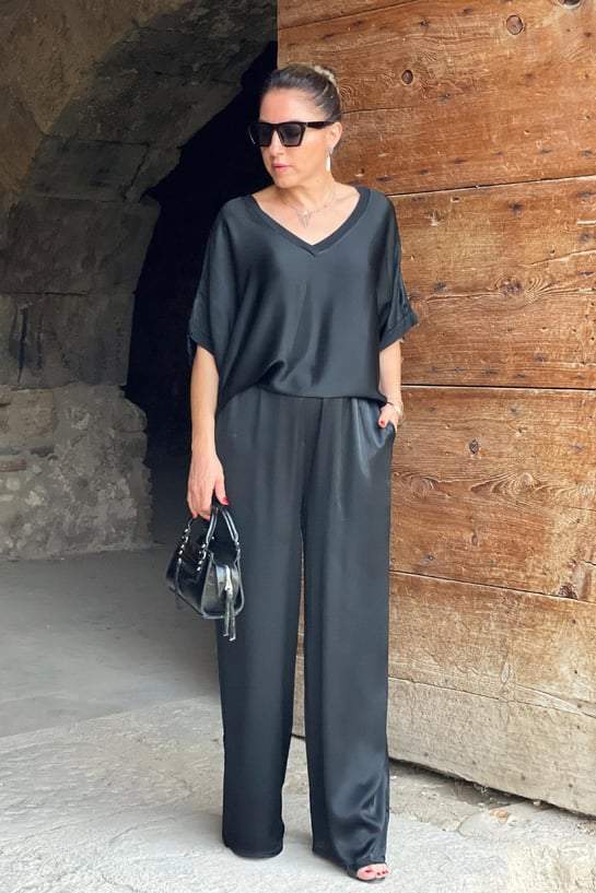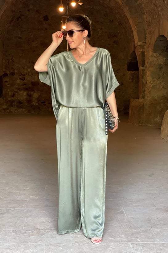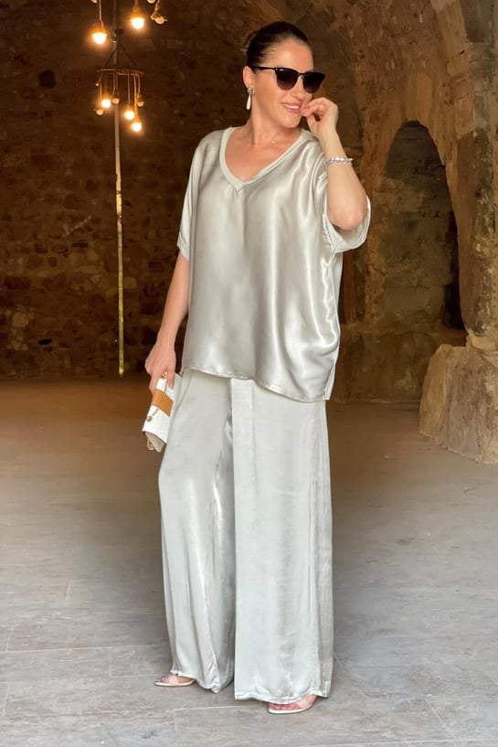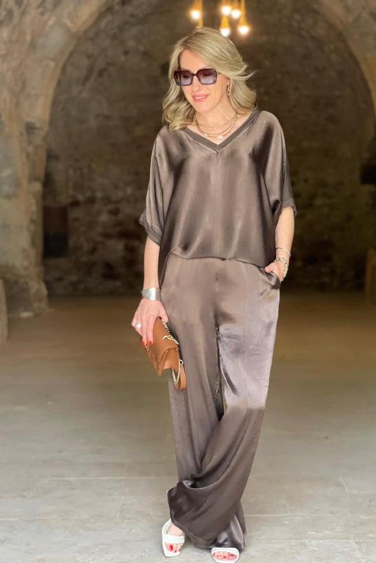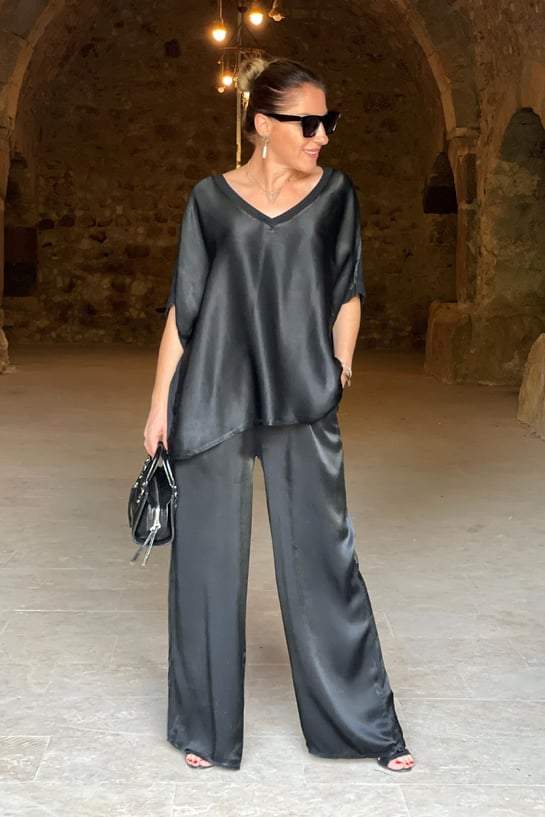 Casual women's cotton and linen V-neck bat sleeve top + slit pants two-piece set