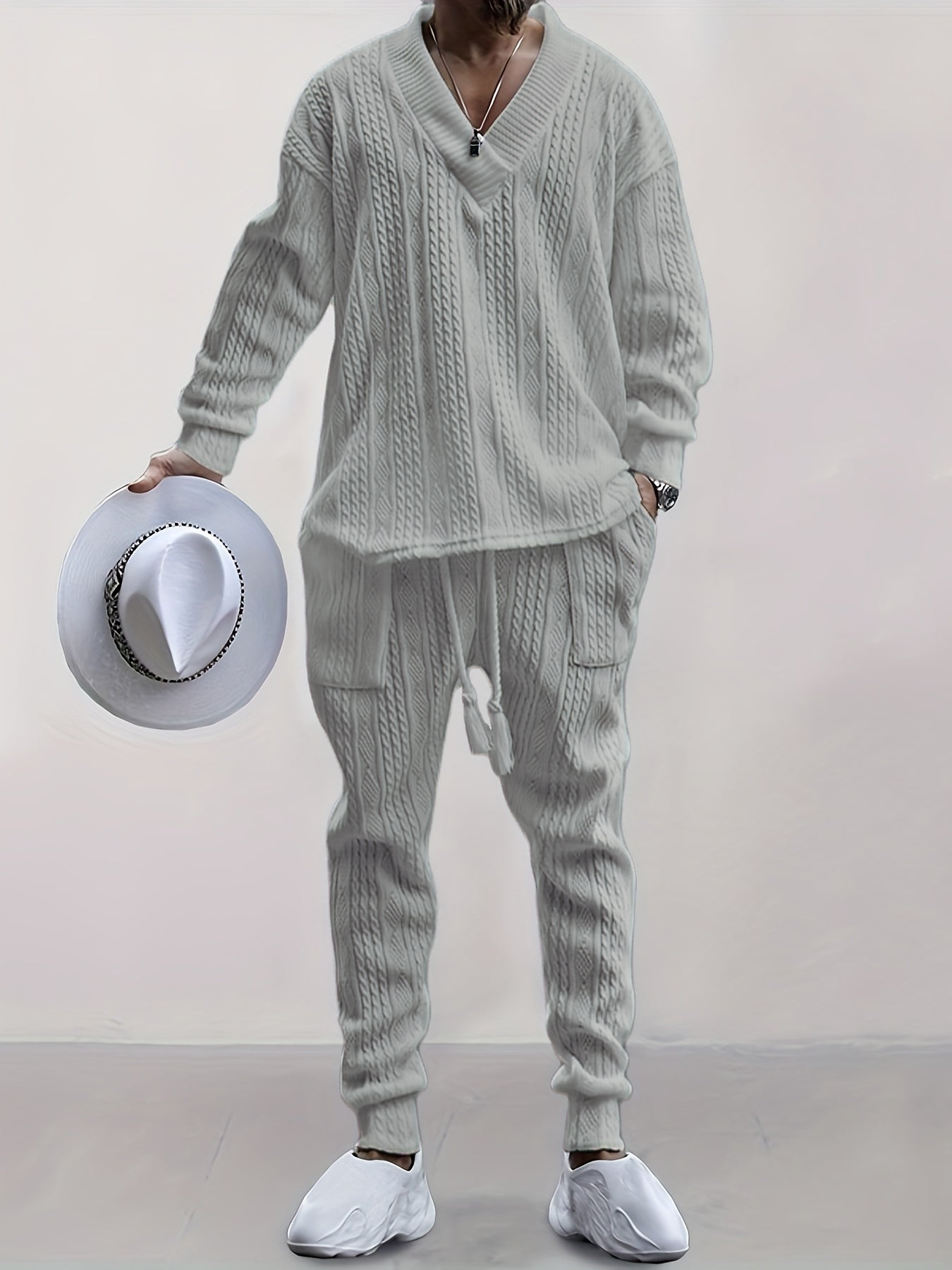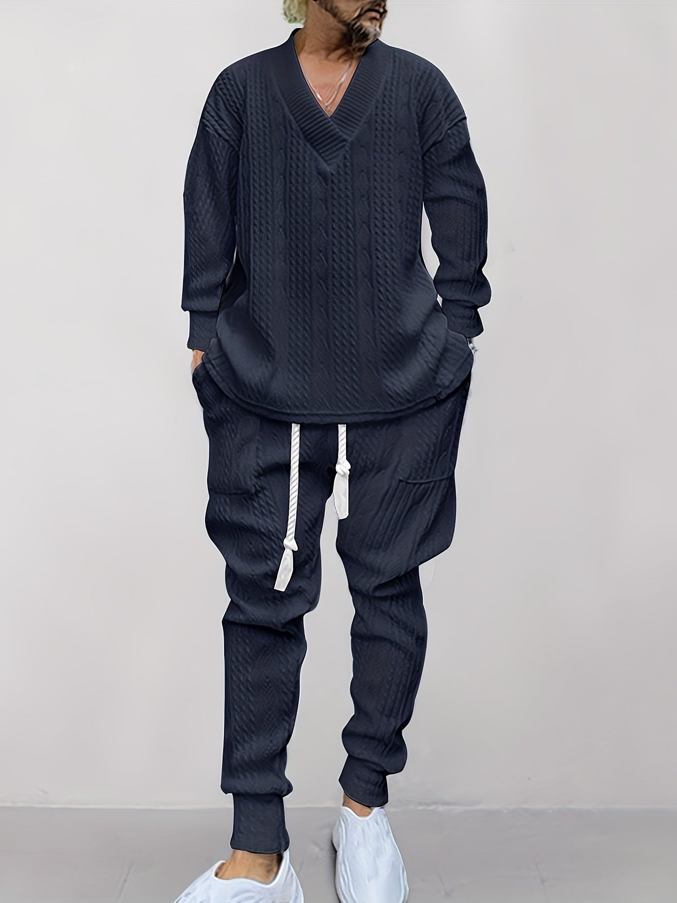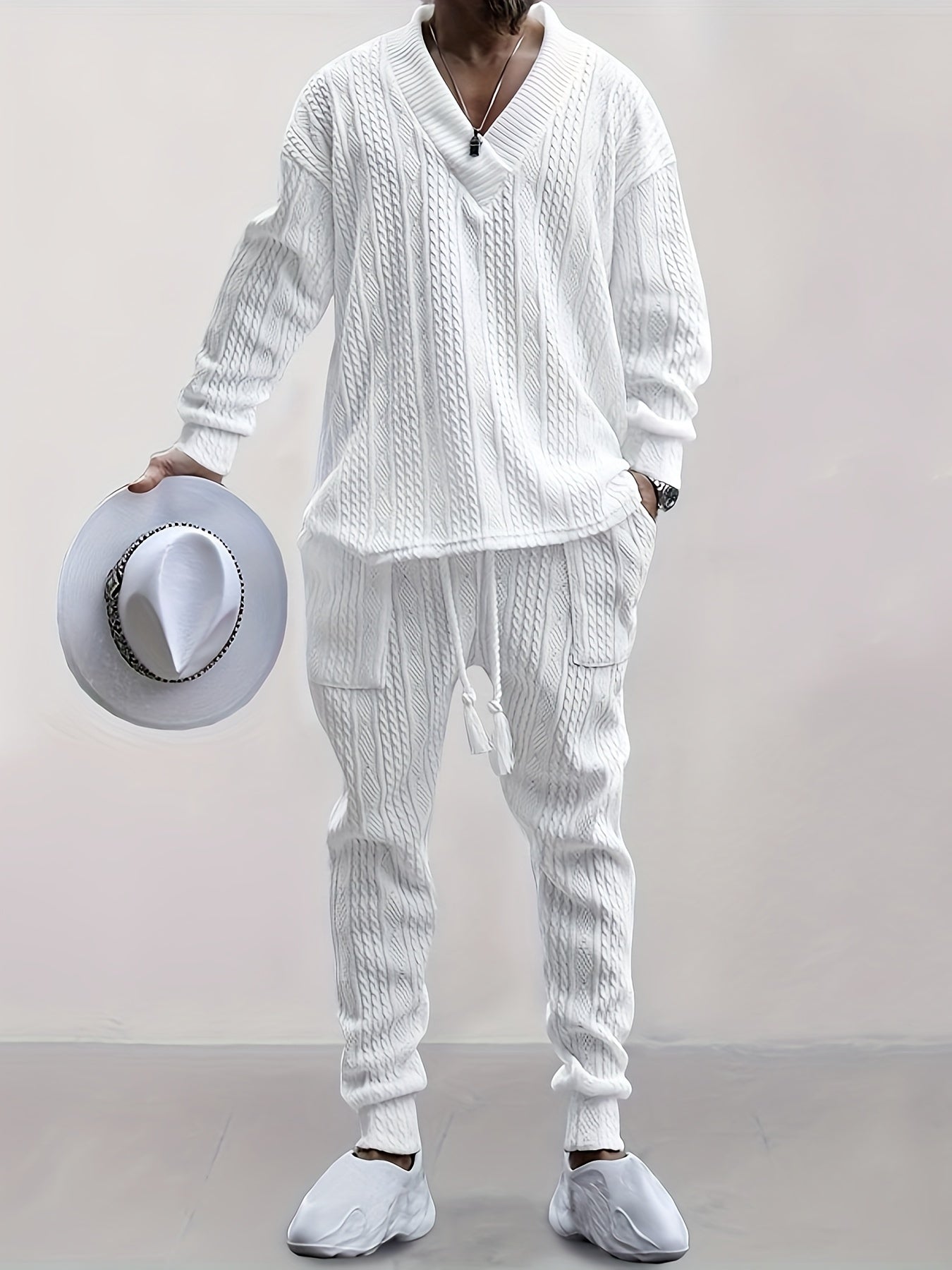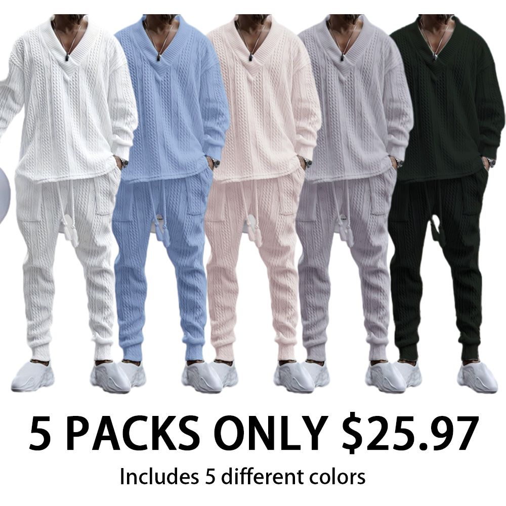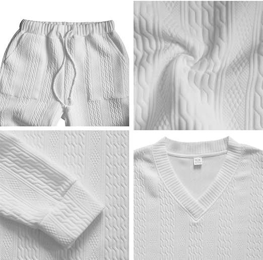 Mens V Neck Sweatshirt Jacquard Tracksuit 2 Piece Men Baggy Sweatsuit Sets Men's Jogging Tracksuit Set Outfit for Men
