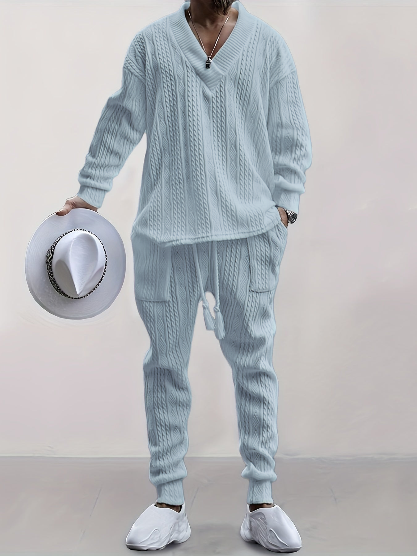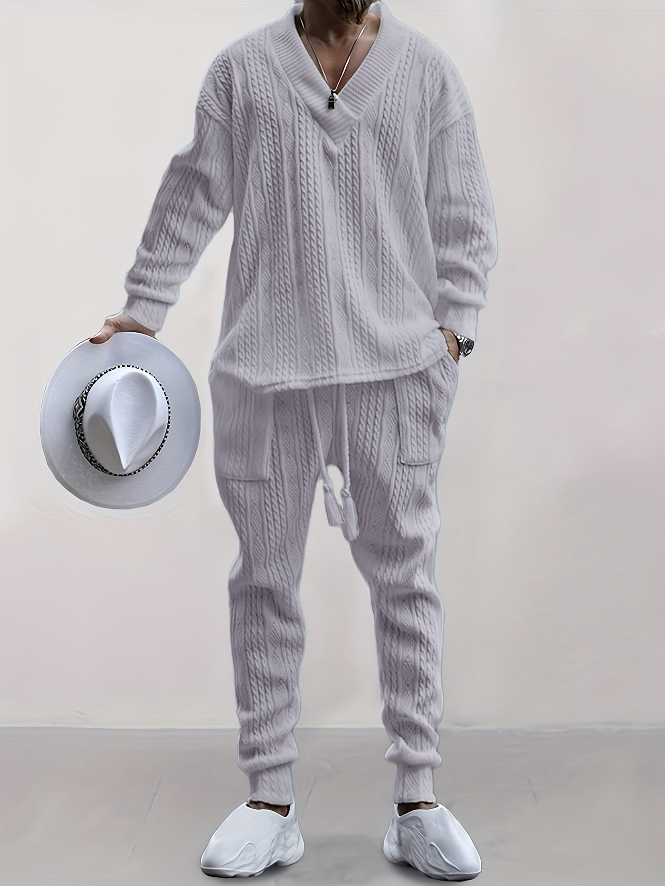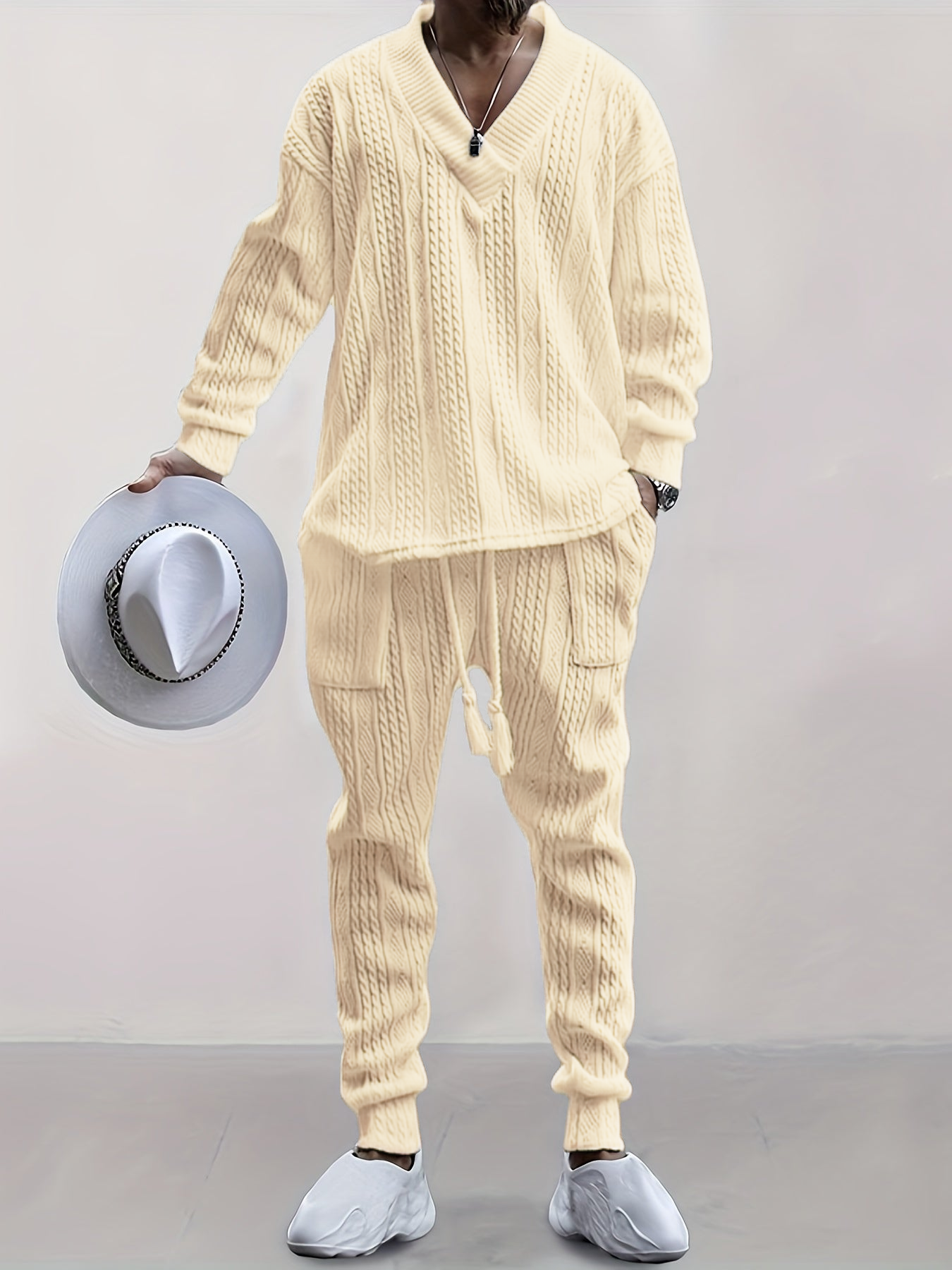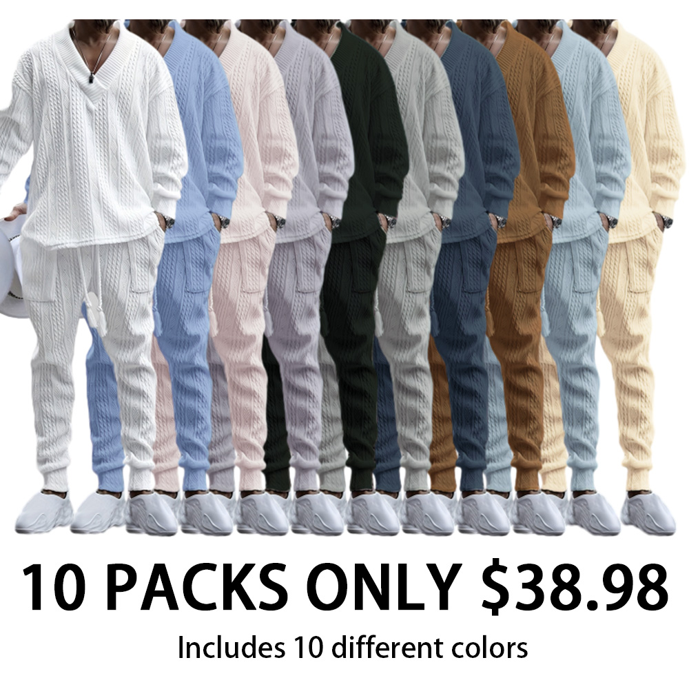 Mens V Neck Sweatshirt Jacquard Tracksuit 2 Piece Men Baggy Sweatsuit Sets Men's Jogging Tracksuit Set Outfit for Men