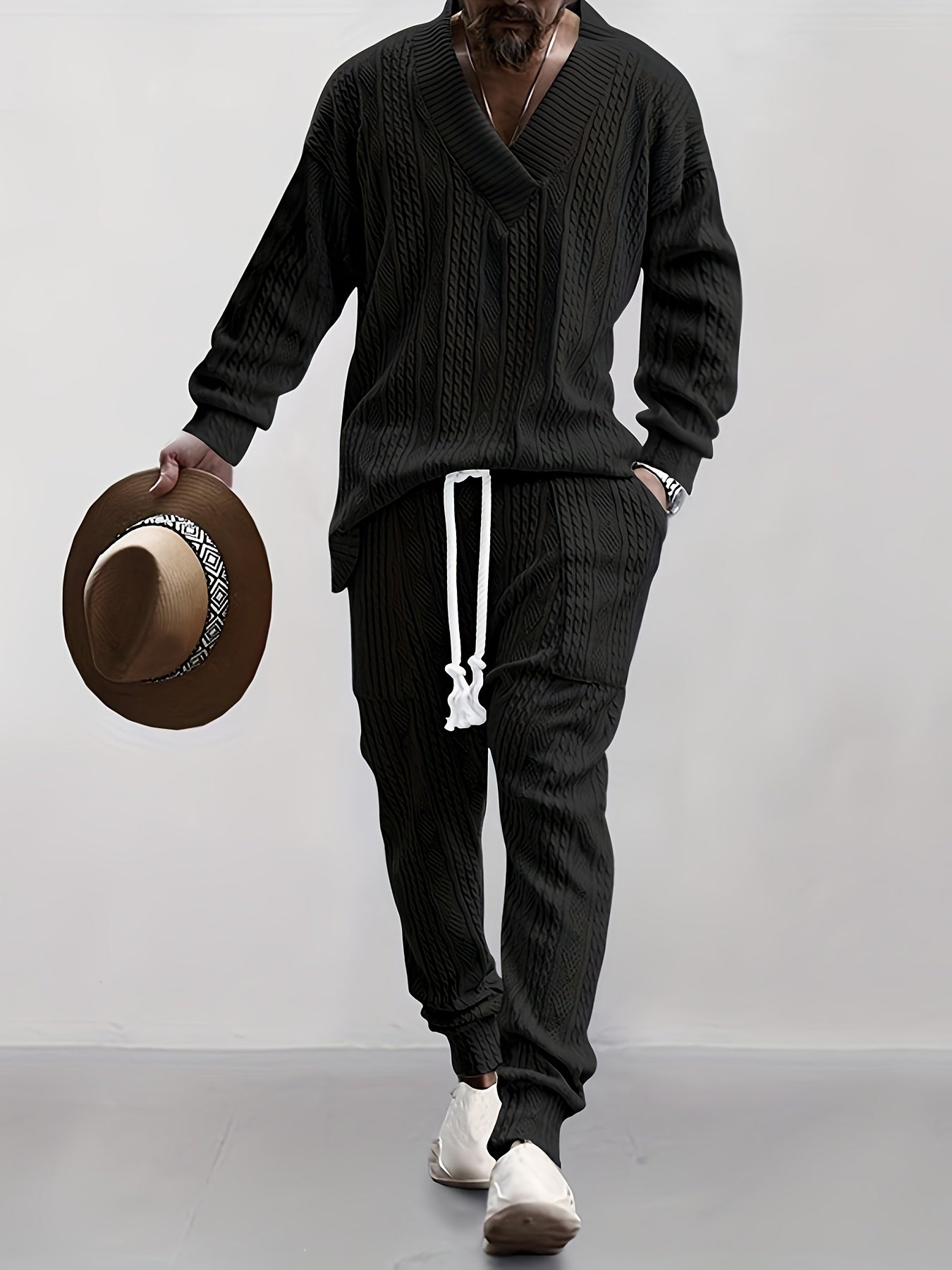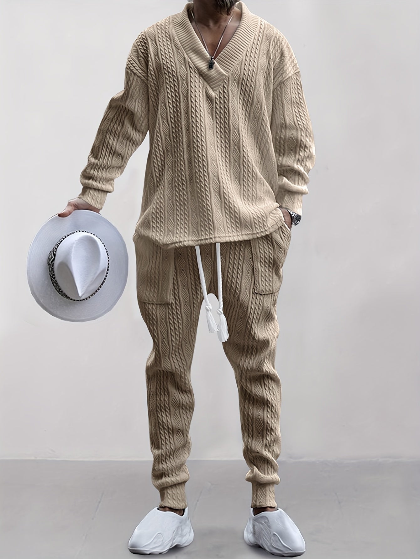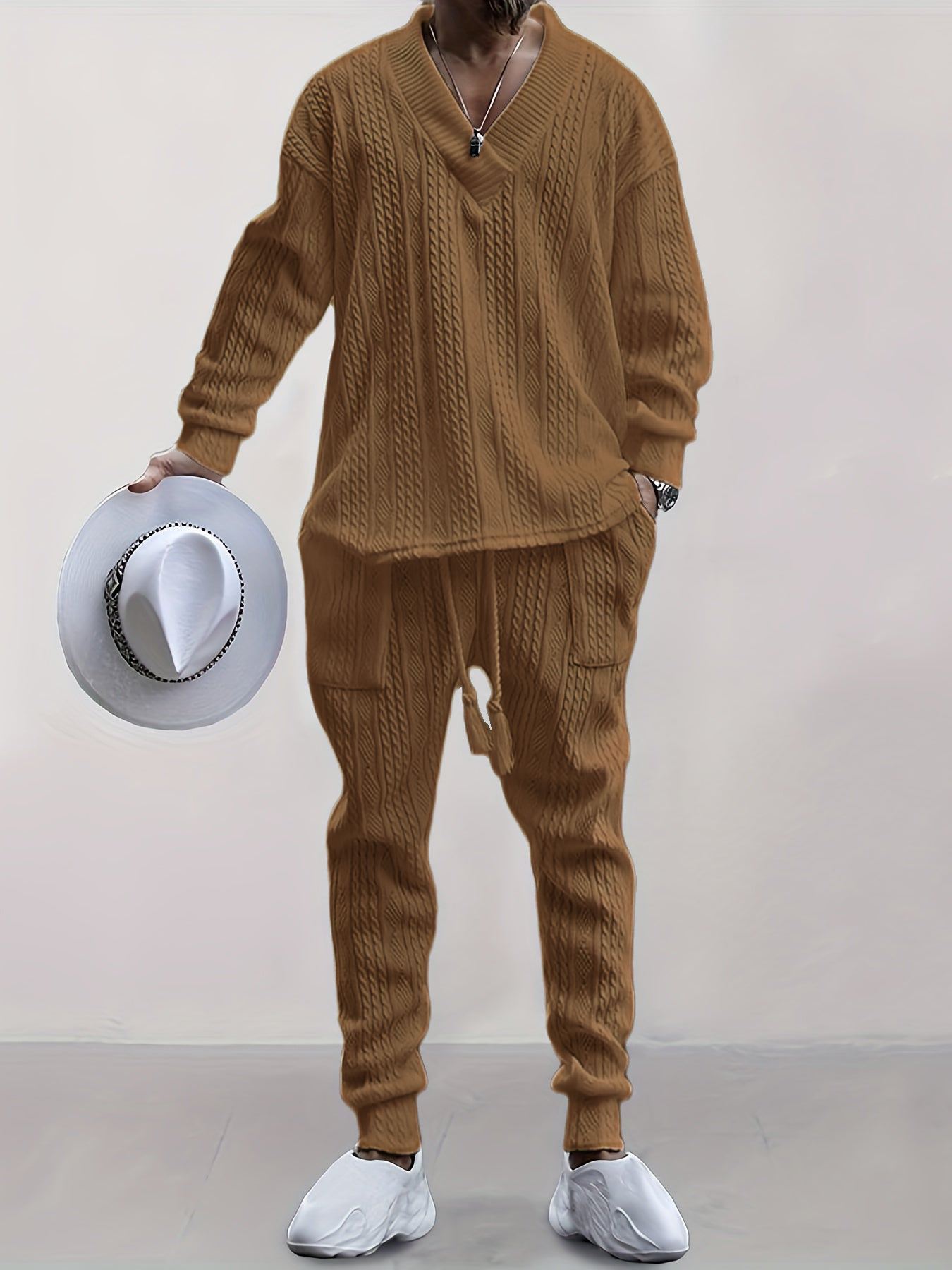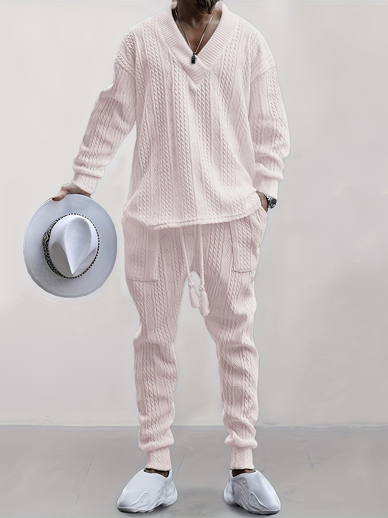 Mens V Neck Sweatshirt Jacquard Tracksuit 2 Piece Men Baggy Sweatsuit Sets Men's Jogging Tracksuit Set Outfit for Men