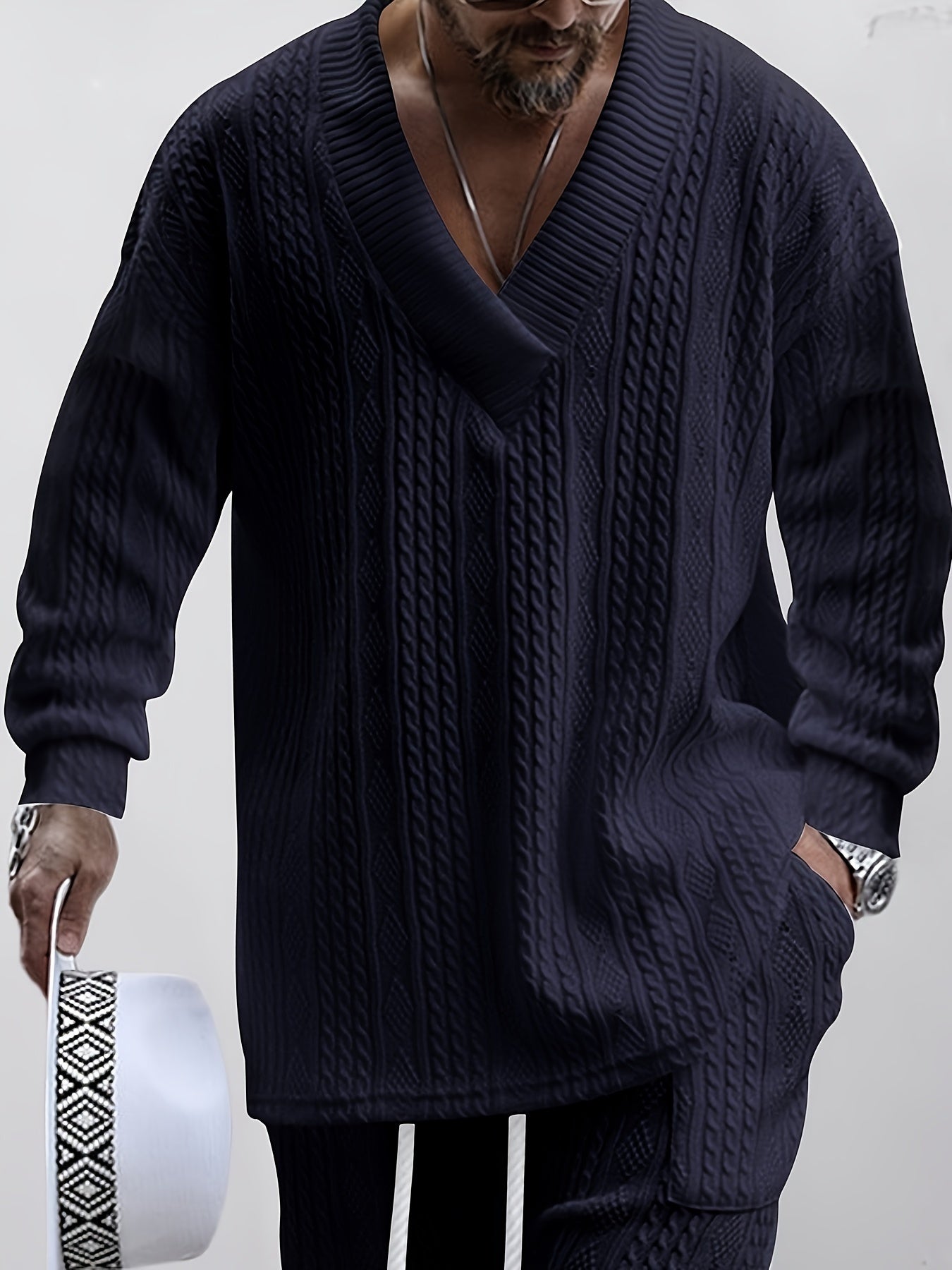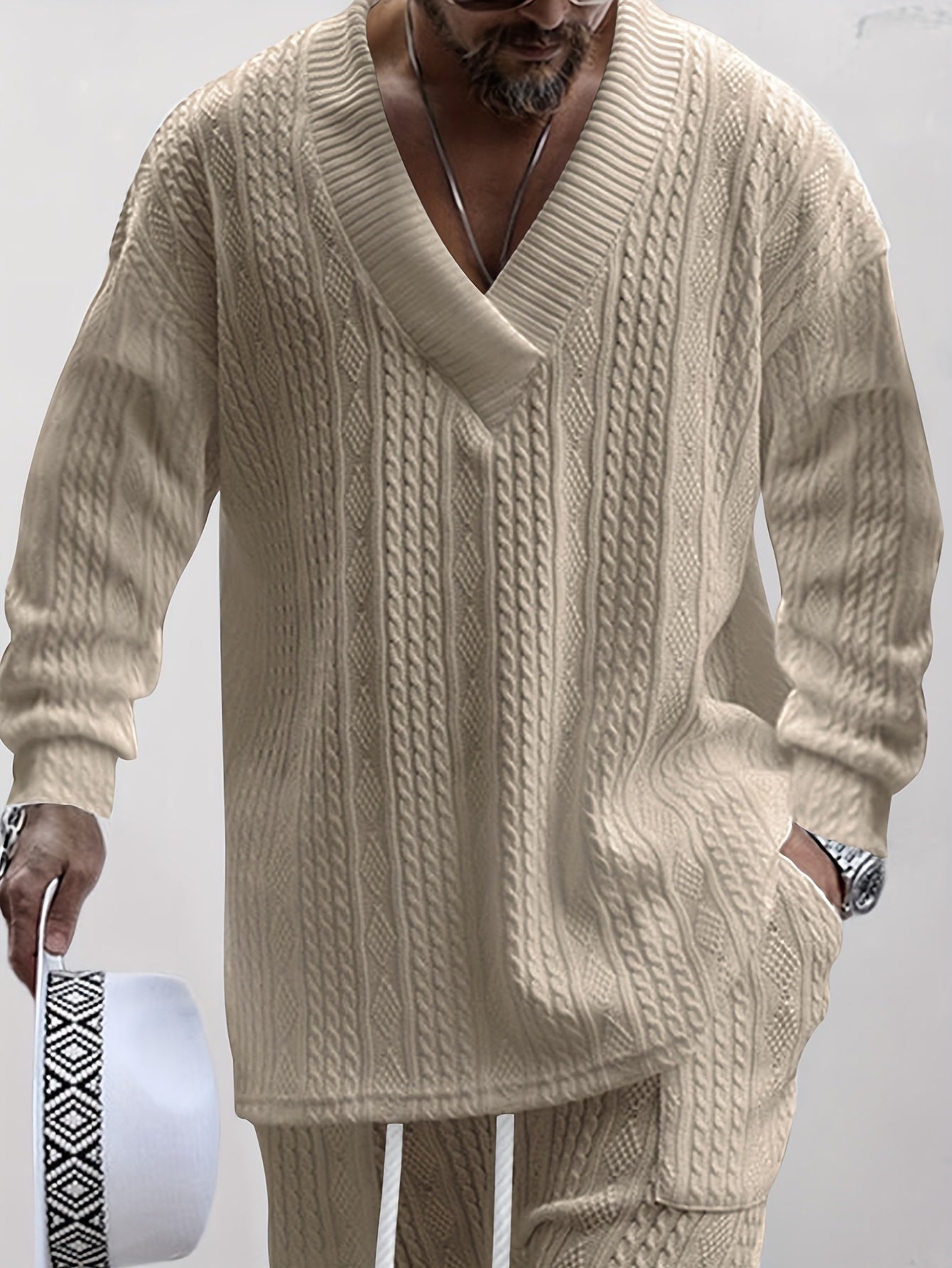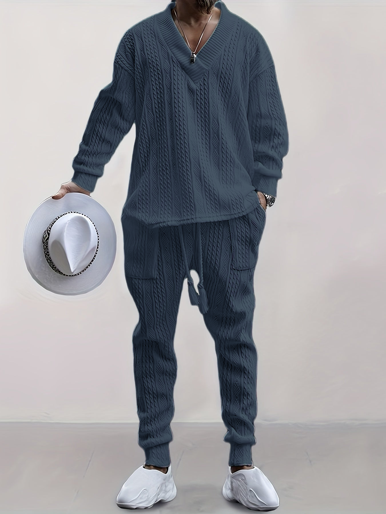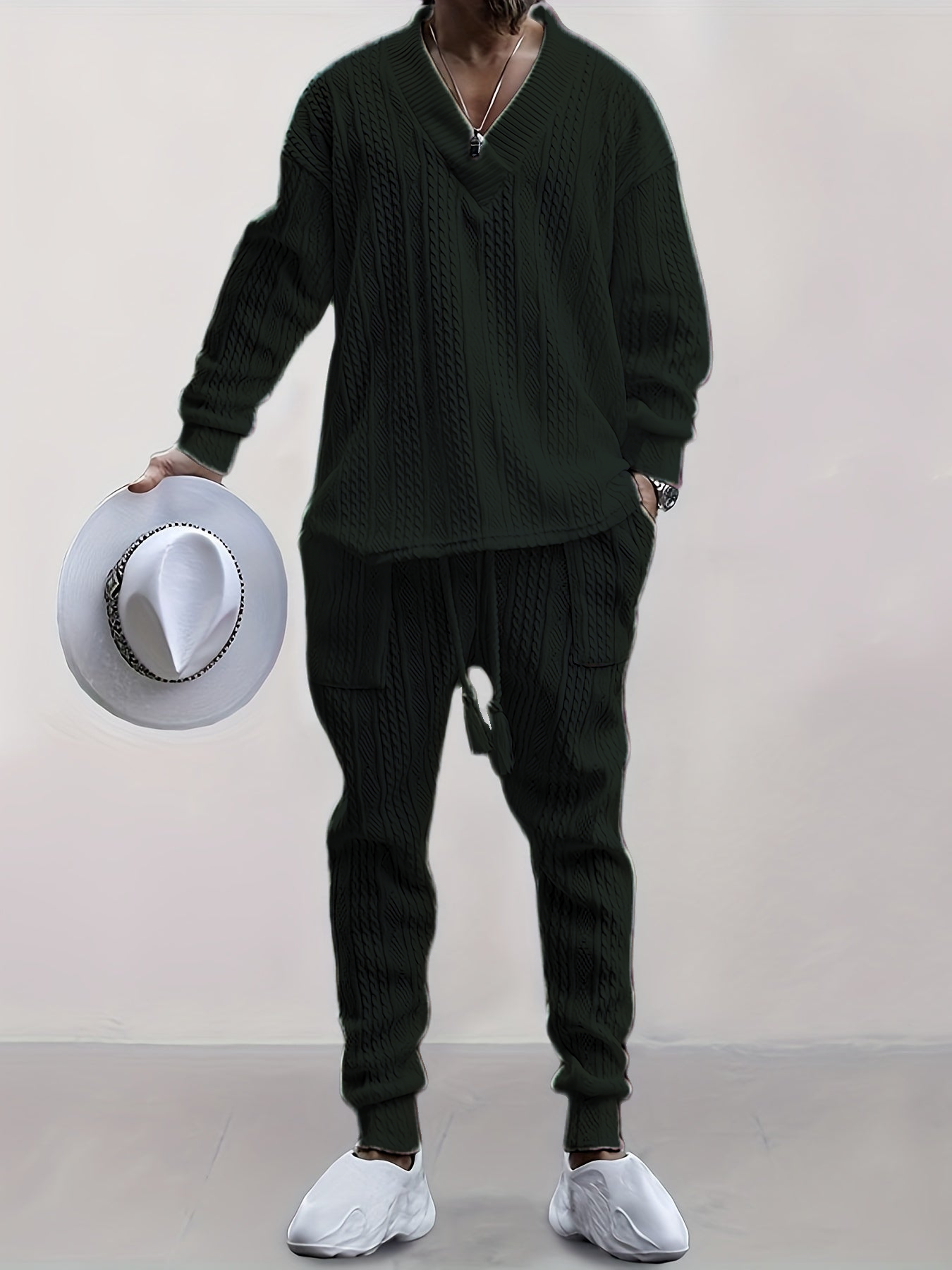 Mens V Neck Sweatshirt Jacquard Tracksuit 2 Piece Men Baggy Sweatsuit Sets Men's Jogging Tracksuit Set Outfit for Men